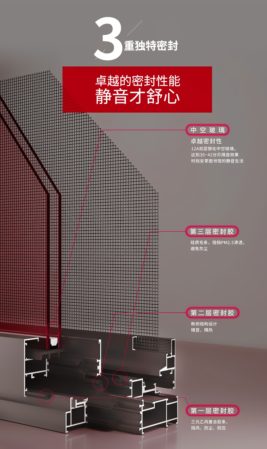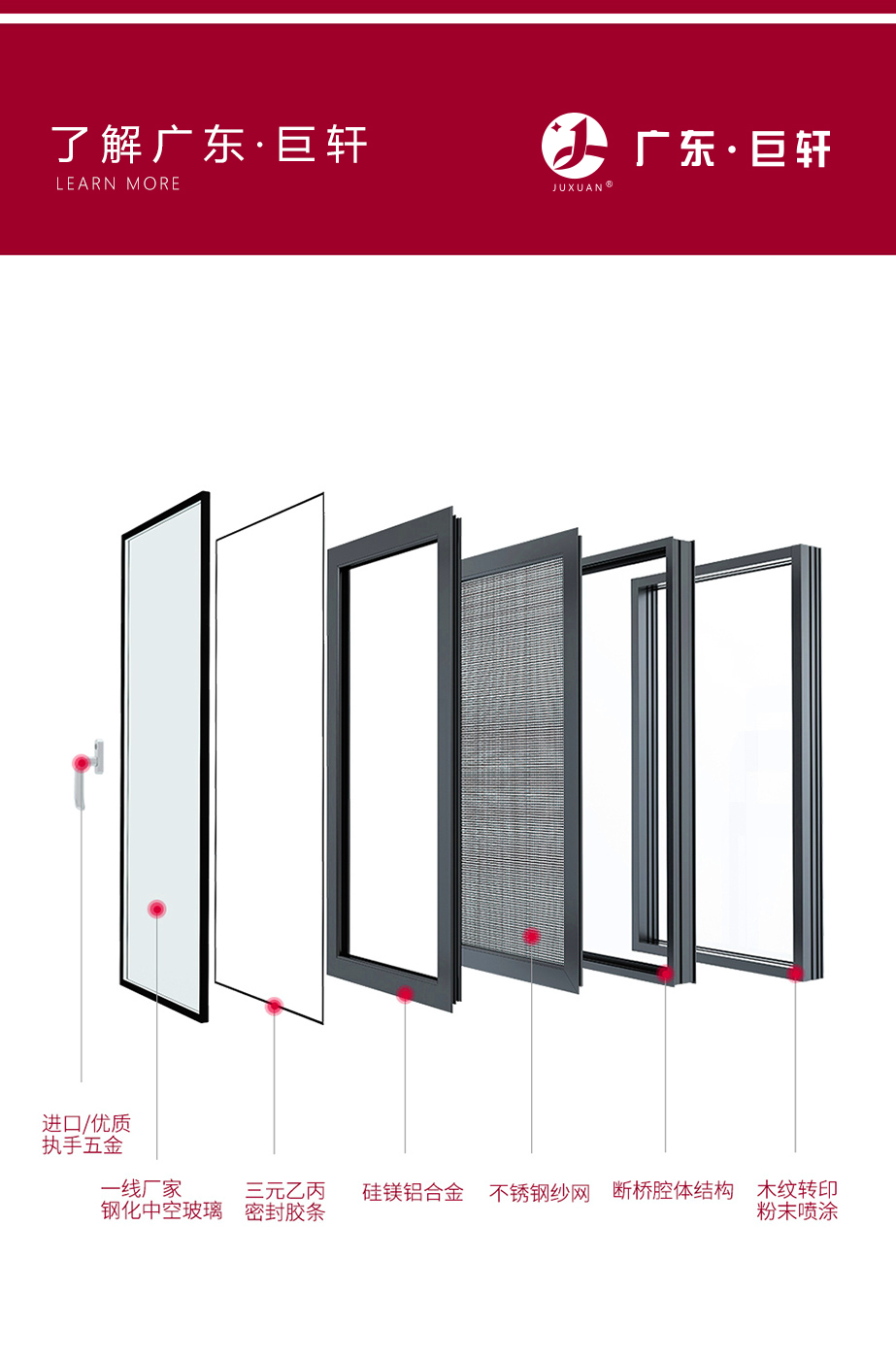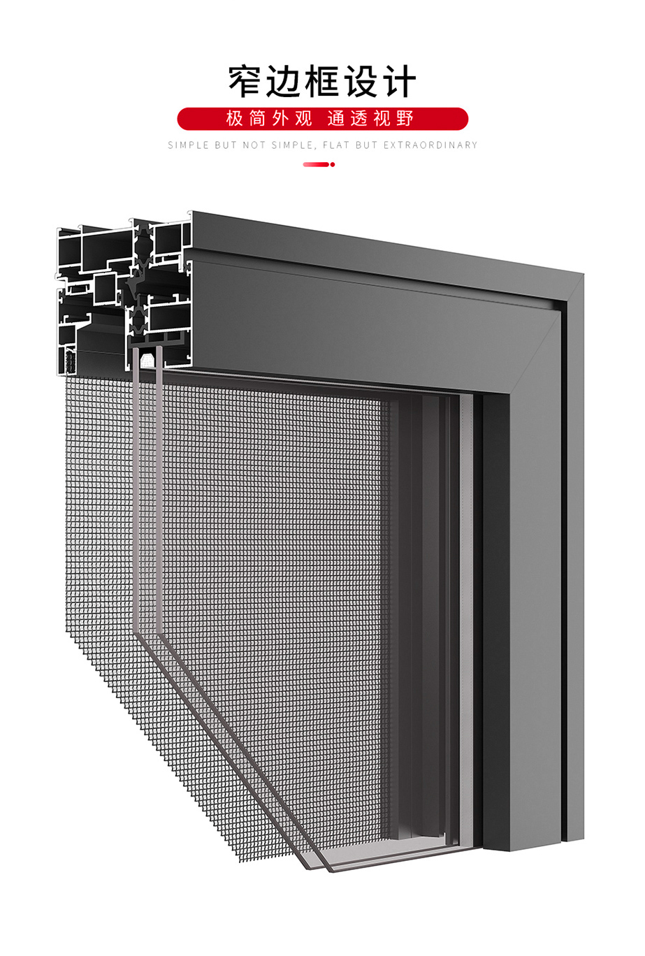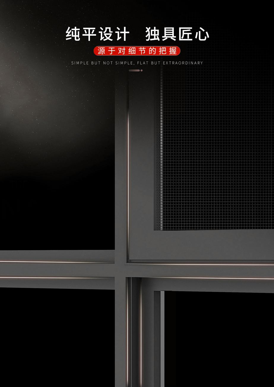 铝镁合金、系统窗结构设计/多腔体静音腔 / 隔热、保温、静音/高品质进口五金配件/注胶工艺/隐藏排水 气密性水密性强/窗纱一体结构,防蚊防盗/可增配防护栏/选配进口五金配件执手、铰链,保障产品性能